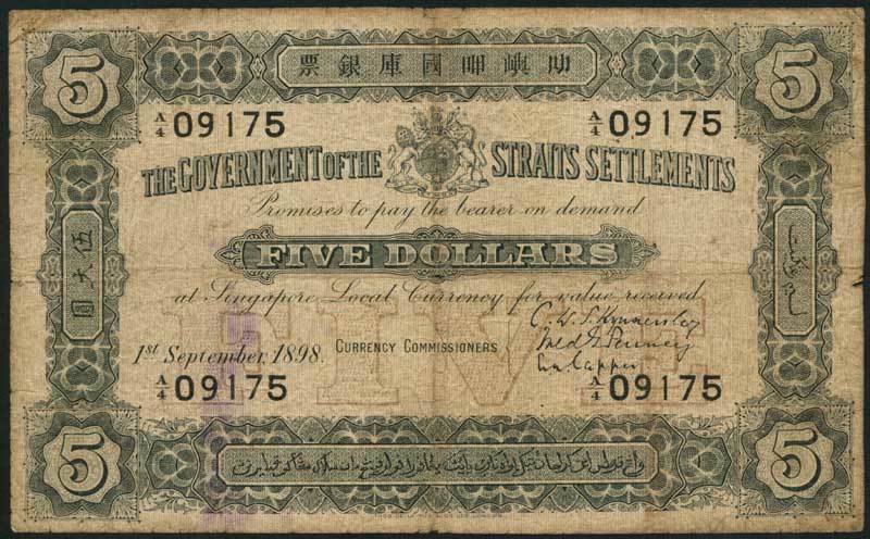 Government of the Straits Settlements, $5, 1 September 1898, serial number A/4 09175, black and pale yellow-brown with value in lilac underprint at centre, arms top centre, value at left and right, signatures of Sneyd-Kynnersley, Penney and Capper, reverse black and cream, tiger at centre, value and kris at left and right