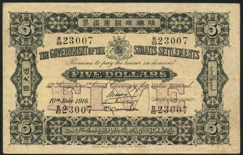 Government of the Straits Settlements, $5, 10 July 1916, serial number B/80 23007, black and pale yellow-brown with value in lilac underprint at centre, arms top centre, value at left and right, signatures of James, Pountney and Saunders, reverse black and cream, tiger at centre, value and kris at left and right