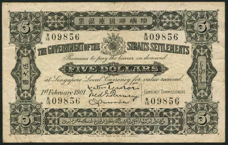 Government of the Straits Settlements, $5, 1 February 1901, serial number B/15 09856, black and pale yellow-brown with value in lilac underprint at centre, arms top centre, value at left and right, signatures of Egerton, Penney and Saunders, reverse black and cream, tiger at centre, value and kris at left and right