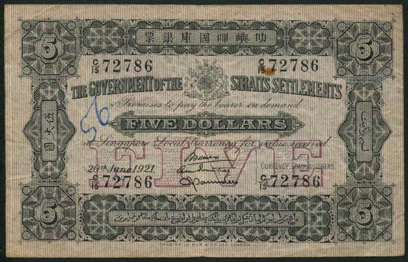 Government of the Straits Settlements, $5, 20 June 1921, serial number C/15 72786, black and pale cream-brown with value in lilac underprint at centre, arms top centre, value at left and right, signatures of James, Pountney and Saunders, reverse black and cream, tiger at centre, value and kris at left and right