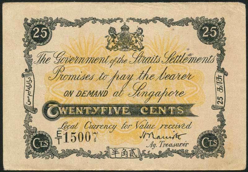 Government of the Straits Settlements, 25 cents, ND (1917), serial number E/1 15007, black text on pale tan and yellow-orange, arms top centre, value low centre and at left and right, Marriott signature as Acting treasurer, reverse pale orange-brown, tiger at centre