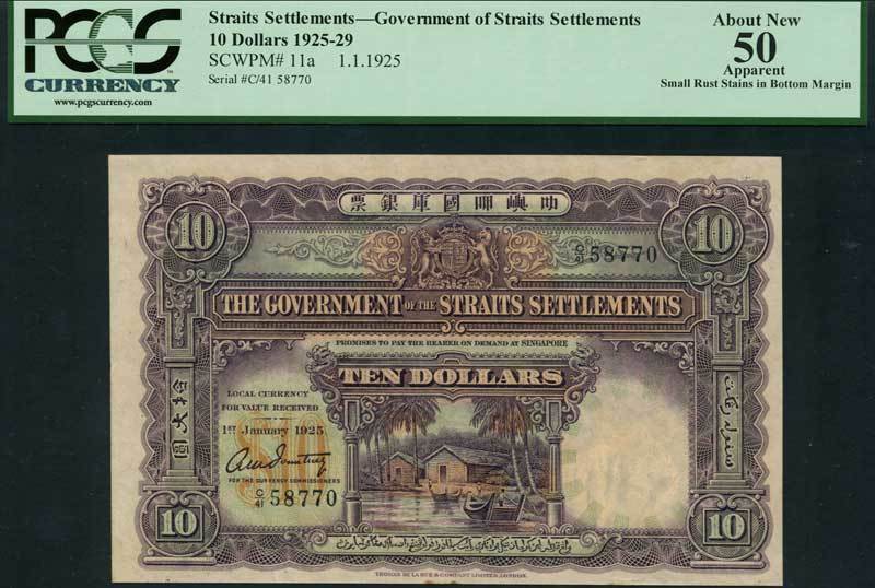 Government of the Straits Settlements, $10, 1 January 1925, serial number C/41 58770, violet and pale blue-green, value in orange brown underprint at left, arms top centre, Pountney signature low left, boats and huts by the water low centre, reverse violet, man and bullock cart at centre, value at left and right
