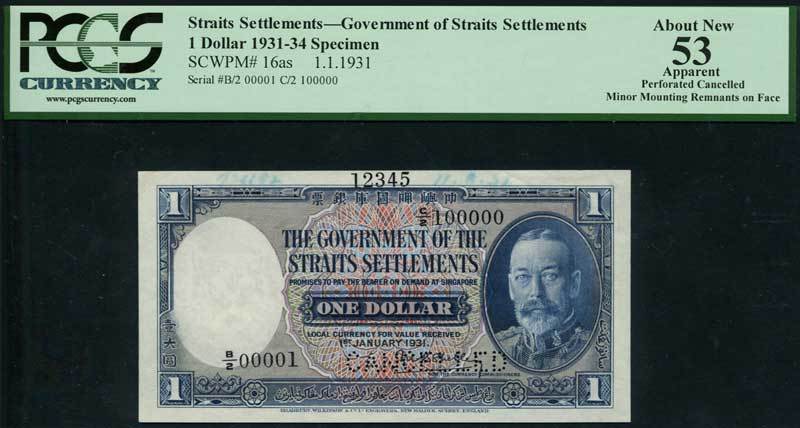 Government of the Straits Settlements, printers archival specimen $1, 1 January 1931, serial number B/2 00001-C/2 100000, blue and multicoloured, George V at right, value at centre and at each corner, Shelley signature low right, reverse blue, tiger at centre, medallic female head at left, perforated CANCELLED,