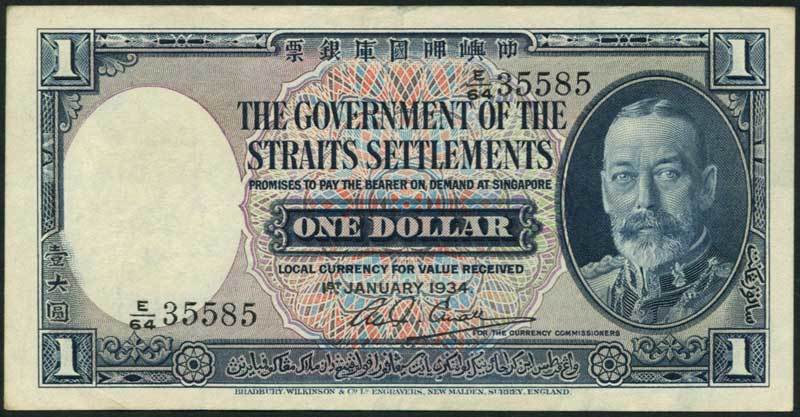 Government of the Straits Settlements, $1, 1 January 1934, serial number E/64 35585, blue and lilac and pale blue, George V at right, Curral signature low centre, value at centre and at each corner, reverse blue, medallic female head at left, tiger at centre, value at each corner