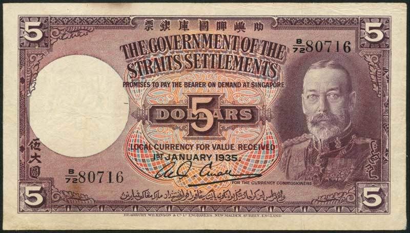 Government of the Straits Settlements, $5, 1 January 1935, serial number B/72 80716, purple, orange and pale blue, George V at right, Curral signature low centre, value at centre and at each corner, reverse purple, medallic female head at left, tiger at centre, value at each corner