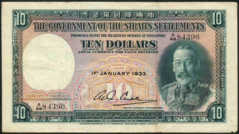 Government of the Straits Settlements, $10, 1 January 1933, serial number A/88 84396, green, orange and pale blue and lilac, George V at right, Curral signature low centre, value at centre and at each corner, reverse green, medallic female head at left, tiger at centre, value at each corner