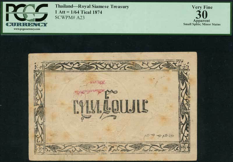 (TBC Saeng-Ngern PM28, Pick A23), issued by the authority of King Rama V due to the shortage of copper coin and to replace the increasing use of gambling chips (porcelain Pee) as semi-official currency. Embossed seals, annotations on reverse, in PCGS holder number 30, an original very fine and extremely rare