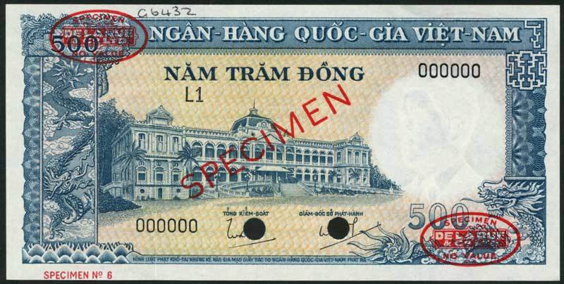 National Bank of Vietnam, specimen 500 Dong, ND (1962), serial number L1 000000, bluish green on gold and pink underprint, Norodom Palace at centre, dragon at left and lower right, signatures of Tong-Kiem-Soat and Giam-Doc So Phat-Hanh, reverse blue and green, farmer with two water buffalo, overprinted SPECIMEN in red with two De La Rue Specimen oval stamps, two punch holes,