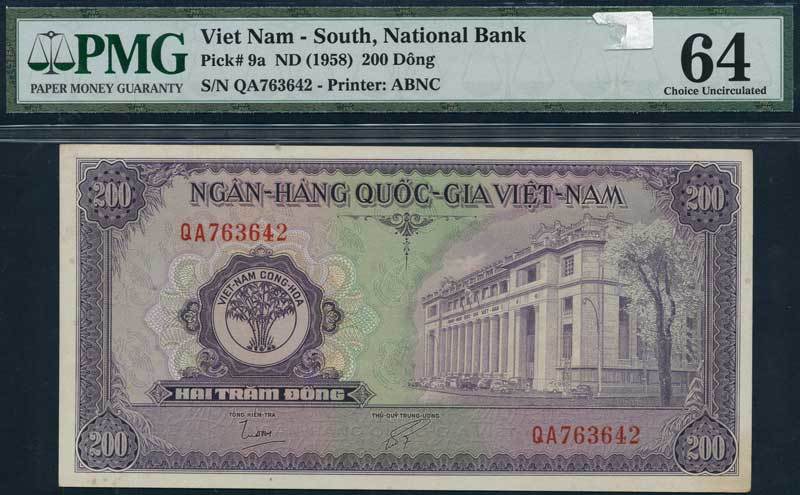 National Bank of South Vietnam, 200 dong, ND (1958), serial number QA763642, purple and green, government building at right, reverse purple, sailing boats