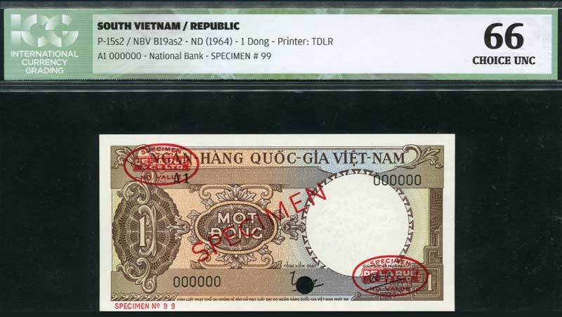 National Bank of Vietnam, specimen 1 dong (3), ND (1964), serial number A1 000000, brown, pale pink and green, value at left, signatures of Tong-Kiem-Soat and Giam-Doc So Phat-Hanh, reverse pink-brown, farmer on tractor at right, one red GIAY-Mau, one red SPECIMEN overprint and one perforated CANCELLED,