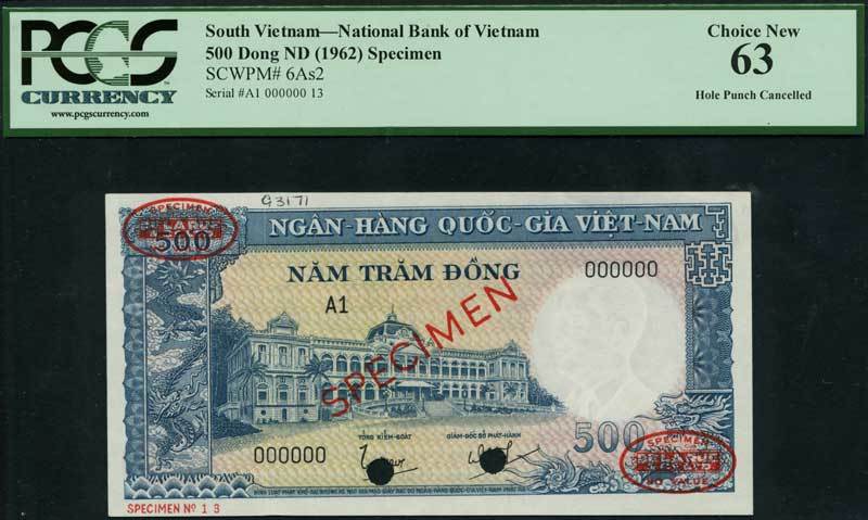 National Bank of Vietnam, specimen 100 dong, ND (1960), serial number A1 000000, purple-brown and pale blue-green, National Assembly building at right, reverse Dong Cam dam, also specimen 500 dong, ND (1962), serial number A1 000000, blue and pink and yellow-green, Norodom Palace, signatures of Tong-Kiem-Soat and Phat-Hahn, reverse blue, water buffalo, both with red SPECIMEN overprint and cancellation holes
