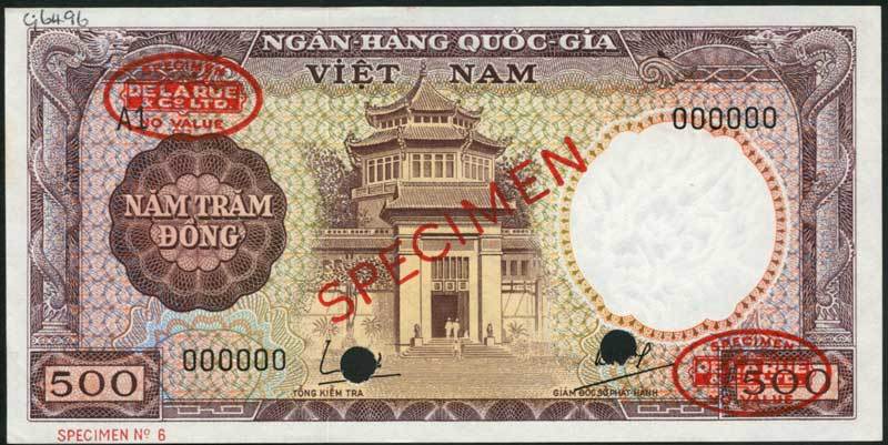 National Bank of Vietnam, specimen 500 Dong (2), ND (1964), serial number A1 000000, purple on multicoloured underprint, National Museum in Saigon at centre, signatures of Tong-Kiem-Soat and Giam-Doc So Phat-Hanh, reverse purple, pale orange and green, two stylised dragons at centre, value at right, red SPECIMEN overprint, perforated
