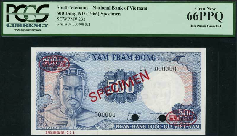 National Bank of Vietnam, specimen 500 dong (2), ND (1966), bot serial number U4 000000, blue, Tran Hung Dao at left, value at centre and at left and right, reverse blue, ships, one red SPECIMEN overprint, one perforated SPECIMEN