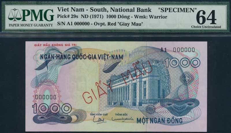 National Bank of Vietnam, South Vietnam, a specimen set from the 1970 issue, 100 dong, green, 200 dong, purple. 500 dong, orange, 1000 dong, pink and turquoise, all with National Bank of Vietnam headquarters at right, red GIAY MAU overprint