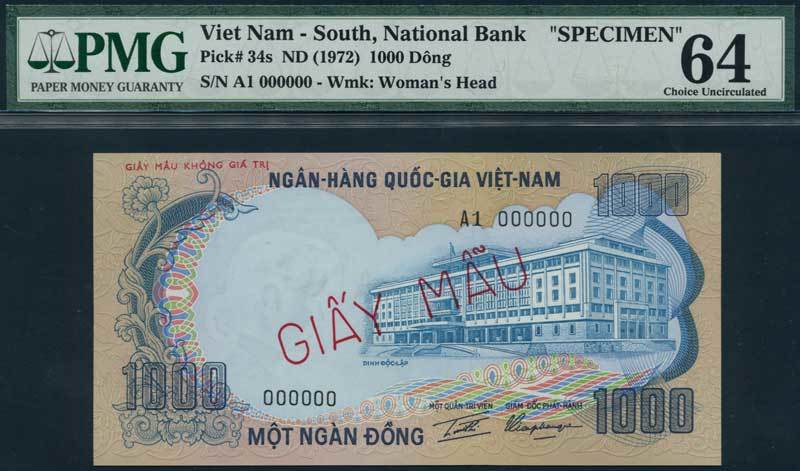 National Bank of Vietnam, a specimen set of the ND (1972) issue, comprising 50 dong, grey-green, 100 dong, green, 200 dong, burgundy, 500 dong, orange, and 1000 dong, blue, all with Palace of Independence at right, animals on reverse, all with GIAY MAU overprint, some with cancellation holes