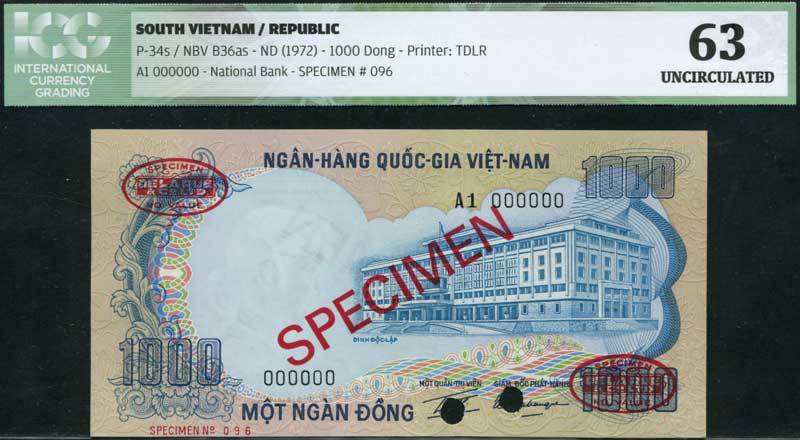 National Bank of Vietnam, specimen 1000 dong (4), ND (1972), two serial number A1 000000, two R1 000000, pale blue and tan, National Bank head office at right, signatures of Mot Quan tri Vien and Giam Doc Phat Hanh, reverse blue-grey, elephants, two red SPECIMEN overprint, two perforated SPECIMEN,