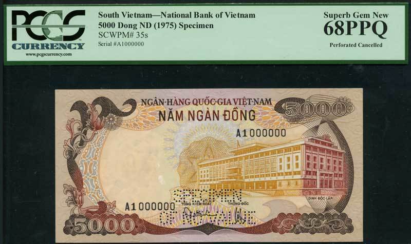 National Bank of Vietnam, specimen 5000 dong (3), ND (1972), all serial number A1 000000, purple and orange-brown, National Bank head office at right, purple and green and lilac, National Bank head office at right, signatures of Tong-Kiem-Soat and Thong-Doc, reverse purple, leopard at left, value at left and right, one red SPECIMEN overprint, one perforated SPECIMEN, one red GIAY-MAU overprint,
