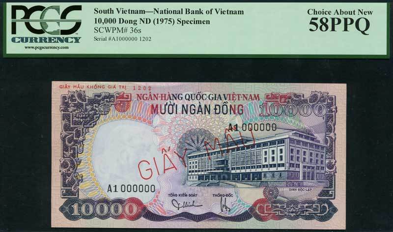 National Bank of South Vietnam, specimen 10000 dong, ND (1972), serial number A1 000000, purple and multicoloured, the Independence Palace in Saigon right centre, signatures of Tong-Kiem-Soat and Thong Doc, reverse purple, water buffalo at left, red GIAY MAU overprint