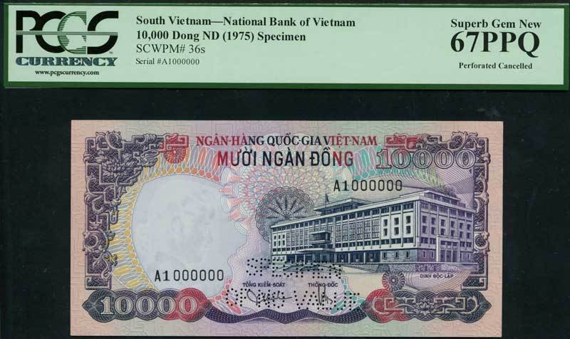 National Bank of Vietnam, specimen 10000 dong (3), ND (1972), all serial number A1 000000, purple and multicoloured, National Bank head office at right, purple and green and lilac, National Bank head office at right, signatures of Tong-Kiem-Soat and Thong-Doc, reverse purple, water buffalo at left, value at left and right, one red SPECIMEN overprint, one perforated SPECIMEN, one red GIAY-MAU overprint,