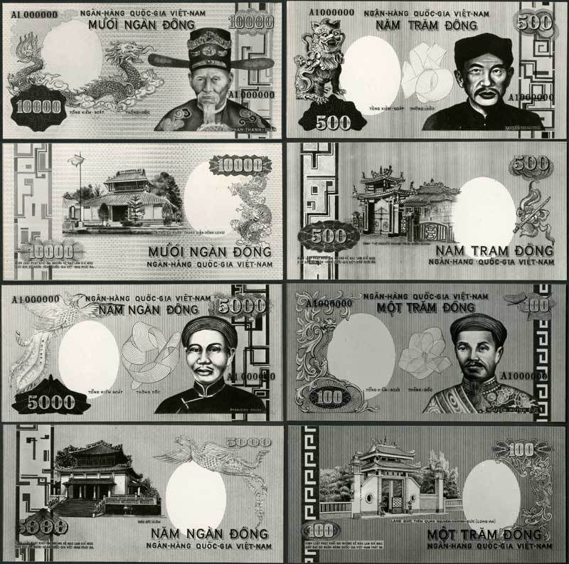 Banque Nationale du Viet-Nam, a file containing letters and cables between the National Bank of Vietnam, the American Banknote Company and Thomas de la Rue, all dated 1975, concerning technical data with regards to the printing of banknotes culminating in a group of obverse and reverse photographs of essays prepared for the National Bank of Vietnam in the denominations of 100,500,5000 and 10000 dong notes all with designs that were never adopted