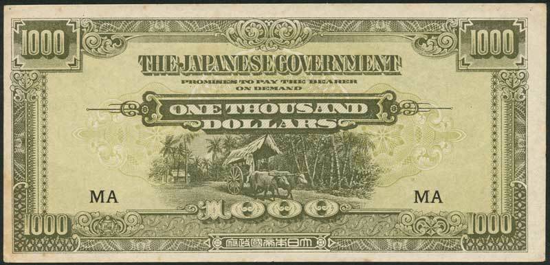 Japanese Occupation Currency, Malaya, 1000 dollars, second issue, ND (1945), black MA in field, green, bullock cart at centre