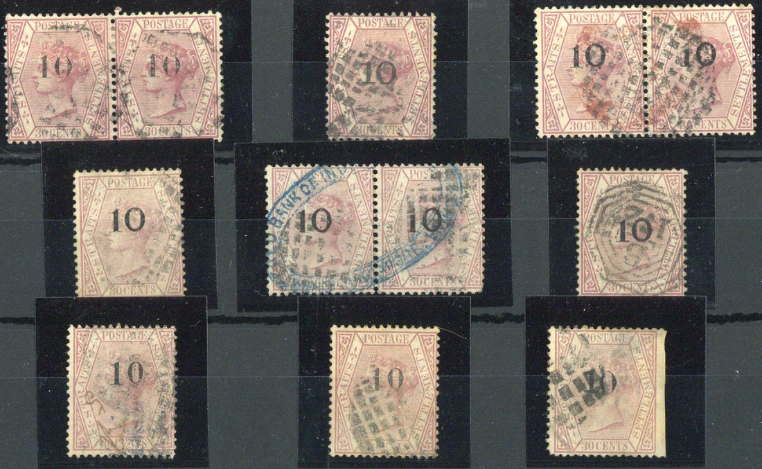 Types "a" pair, "b", "c" pairs (2, both with right stamp showing "1" broken just below the top serif) and singles (2, one slightly faded), "g" (2) and "i" (straight-edge at right, soiled and thinned), one type "c" cancelled "B/172", the rest cancelled by dumb obliterator and both the type "c" pairs with firm's chop, generally fine. R.P.S. Certificate (1970) for one type "g". S.G. 33-36, £2800+