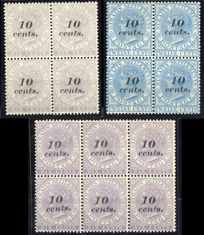 10c. on 6c. lilac first printing block of four and second printing block of six (3x2) and 10c. on 12c. ultramarine block of four, all unused with ....... gum, fine. S.G. 44-45, £1130