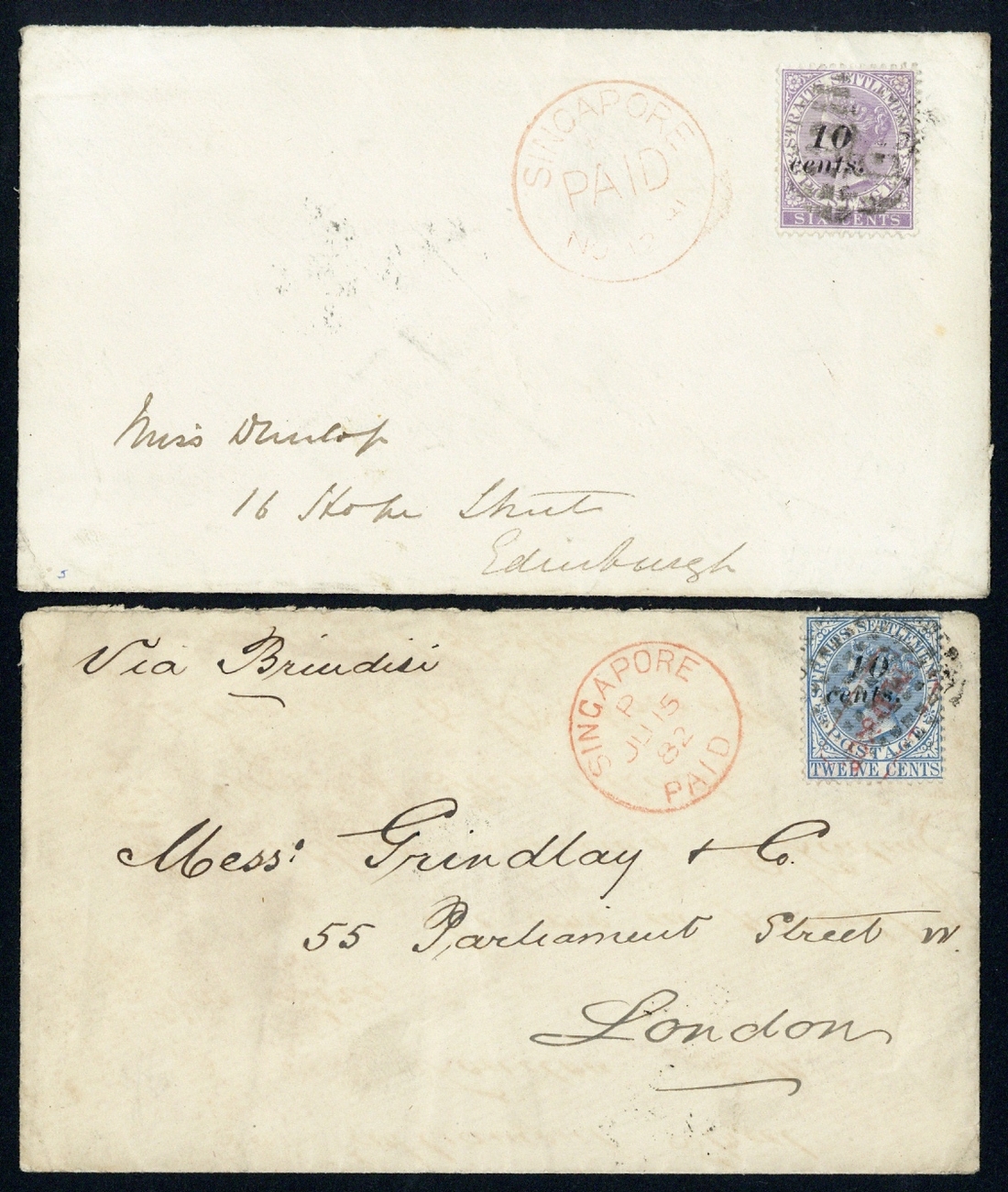 10c. on 6c. lilac on 1881 (Nov.) envelope ex the "Dunlop" correspondence to Edinburgh and 10c. on 12c. blue on 1882 (15 June) envelope (a little soiled) to London, both cancelled by dumb obliterator and showing Singapore Paid despatch c.d.s. in red alongside, the latter also cancelled by small firm's chop in red
