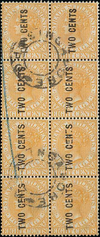 A block of eight (2x4) from Setting I showing two complete strips of the triplet plus the single unit with all letters narrow, twice cancelled by circular undated "singapore/p.o." double-ring h.s., blue crayon stroke at left, fine. A marvellous exhibition item. S.G. 54-57, £960+. Photo