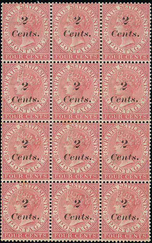 "2/Cents." on 4c. rose block of twelve (3x4), the first stamp on the second row showing variety "s" of "Cents." inverted, the odd minor tone spot on reverse and the lower left stamp with corner crease, otherwise fine mint. A rare multiple. S.G. 61/61a, £2745. Photo