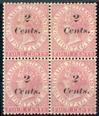 "2/Cents." on 4c. rose block of four, unused with mainly large part original gum, one with small gum thin otherwise fine. S.G. 61, £380