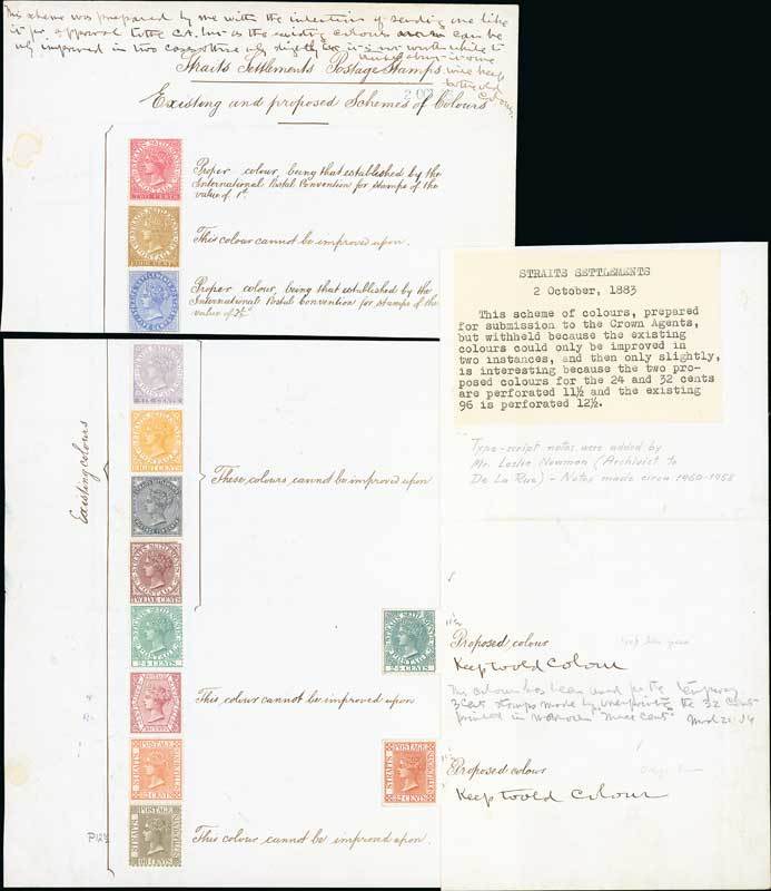 A sheet of paper (195x330mm.; now in two pieces to fit album page) entitled "Existing and proposed Schemes of Colours" bearing 1882 8c. and 10c. together with 1883-91 2c. to 96c., the 30c. and 32c. being imperforate and the 96c. perf 12½, and each with comments on the colour written alongside, the 24c. and 32c. being replaced by two of darker hue (24c. with small defect at top), both being perforated 11½ and both with "Keep to old colour" written alongside. A magnificent lot. Photo
