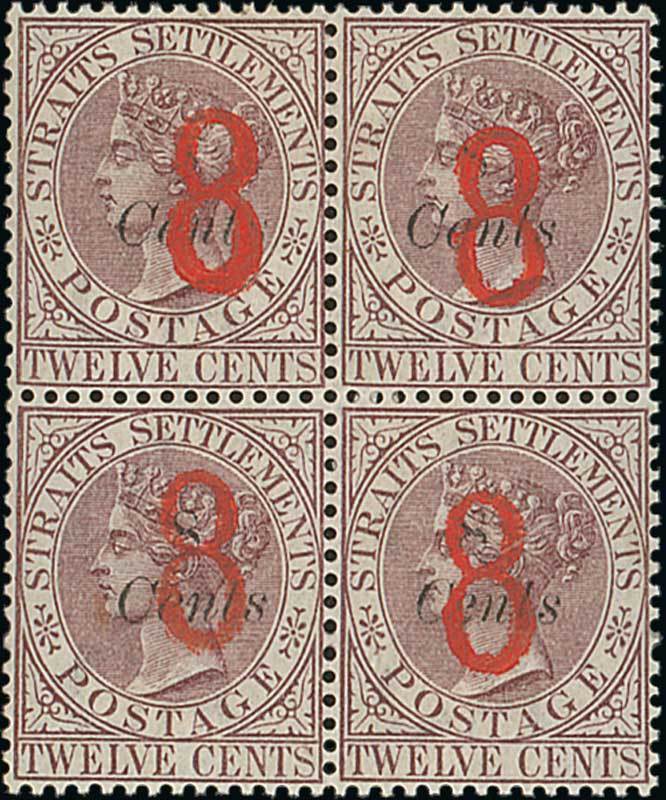 "8" on "8/Cents" on 12c. brown-purple, a block of four with large part original gum, fine. S.G. 80, £2000. Photo