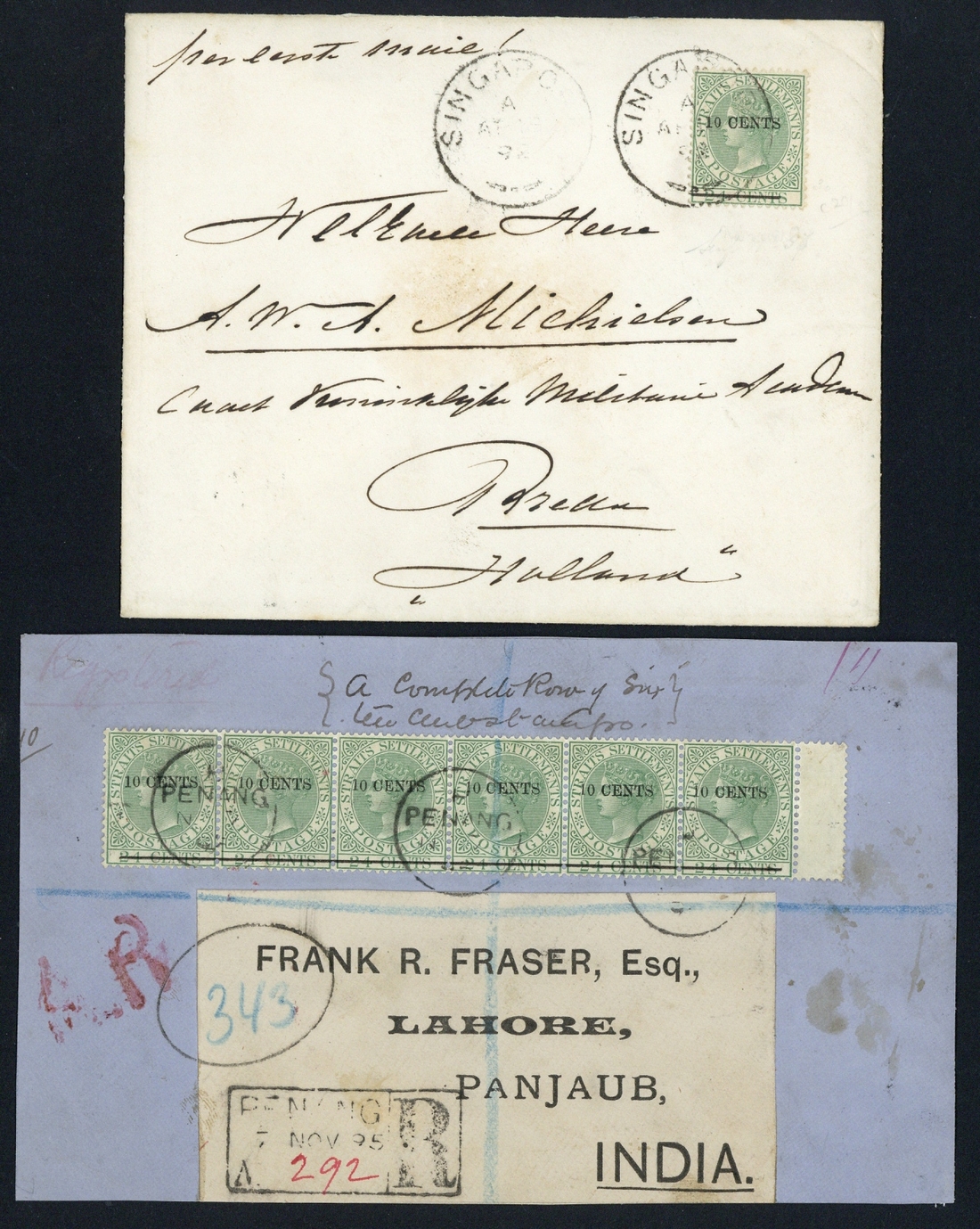 1895 (7 Nov.) front registered from Penang to India, bearing 10c. on 24c. strip of six with interpanneau margin at right, showing registration d.s. and "a.r." h.s. in red; 189? envelope from Singapore to Holland, bearing 10c. on 24c. with variety narrow "0" in "10".