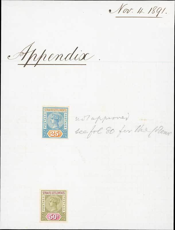 25c. in blue and orange and 50c. in olive-green and carmine, both imperforate proofs with handpainted country name and duty plates, affixed to part of "Appendix" sheet (125x165mm.) dated "Nov 4. 1891", the 25c. marked "not approved", the 50c. in the issued colours. Photo