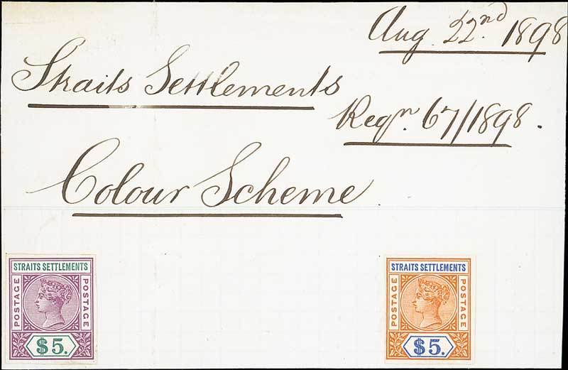 $5 (2) in dull purple and green and in orange and blue affixed to piece (122x80mm.) headed "Straits Settlements, Colour Scheme" and dated "Aug 22nd 1898", fine. Photo