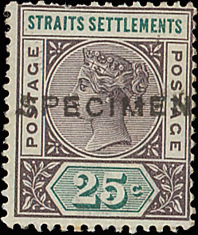 25c. purple-brown and green handstamped "specimen" (Type SS4), large part original gum, a few shortish perfs at top, otherwise fine. S.G. 103. Photo