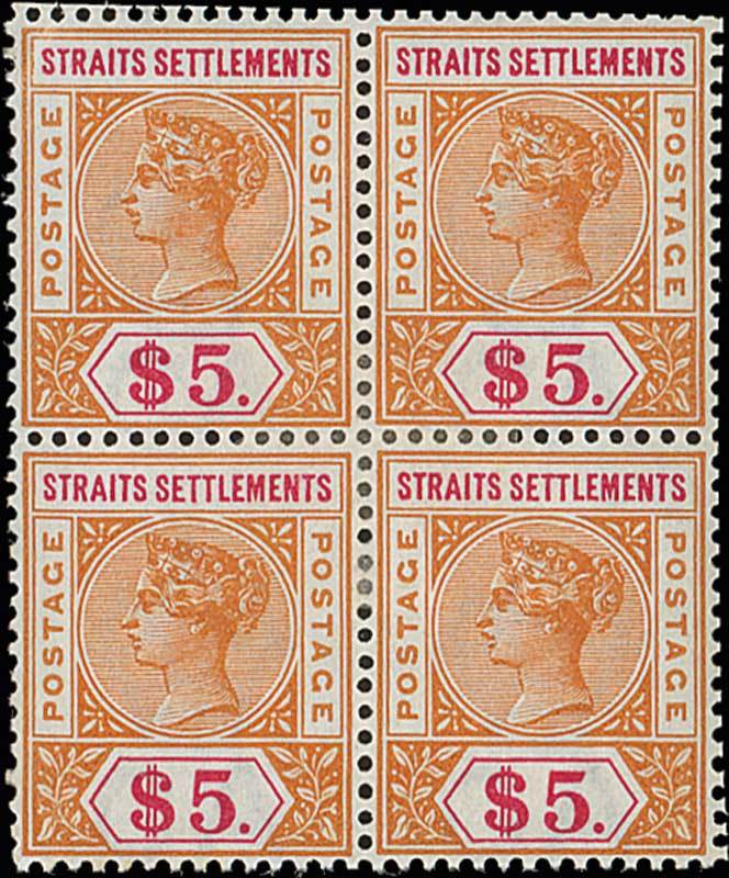 $5 orange and carmine block of four, fresh and fine mint. S.G. 105, £1600. Photo