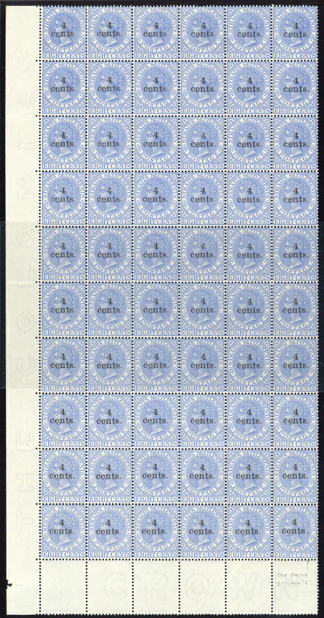 "4/cents" on 5c. brown block of fifty-four (6x9) from the right pane, "4/cents" on blue complete left pane of sixty (6x10) and "4/cents" on 8c. ultramarine complete left pane of sixty with [60] showing spaced stop, fine mint. S.G. 106-108, £800+