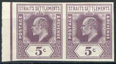 5c. in dull purple, a horizontal pair with part margin at left on gummed watermarked paper, fine.