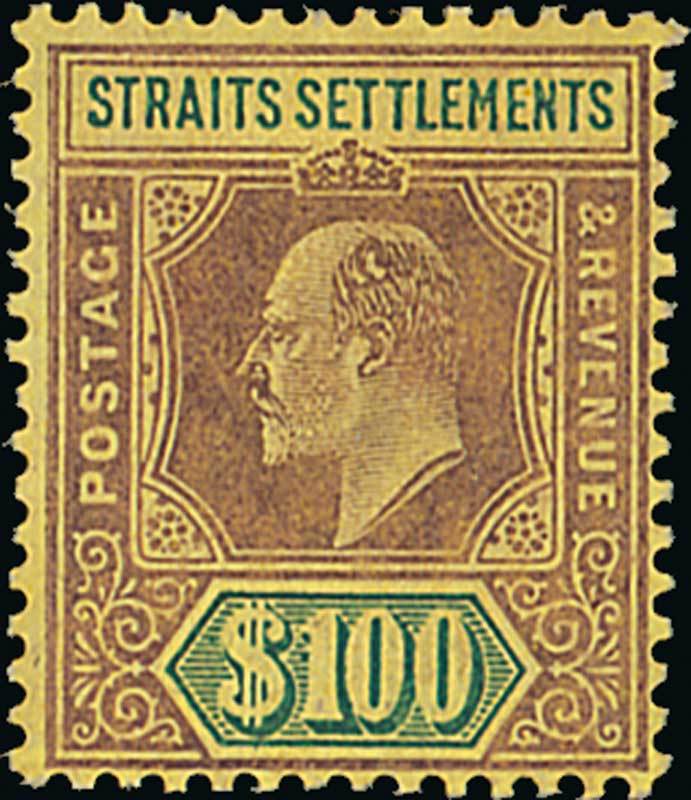 $100 purple and green on yellow, unused with large part original gum. A nice example of this rare stamp. S.G. 140, £18,000. Photo