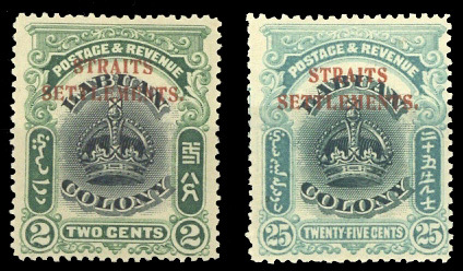 2c. black and green and 25c. green and bluish green, both perf 14½-15, fine mint, the gum dull on the 25c. S.G. 142a, 148a, £290