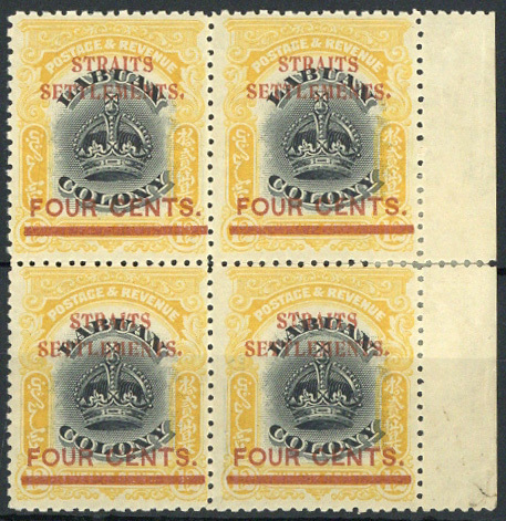 4c. on 12c. black and yellow block of four with sheet margin at right, the lower right stamp with variety line through "B", a few re-enforced perfs at right otherwise fresh and fine unused with large part original gum. S.G. 144.144b, £350+