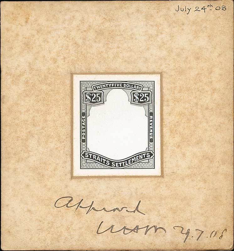 $25 large key-plate master die proof with blank vignette and handpainted country name and duties in Chinese white, inset on thick card (80x85mm.) dated "July 24th 08", marked "Approved", initialled and further dated "29.7.08"; the card with some discolouration though the essay is fine. Photo