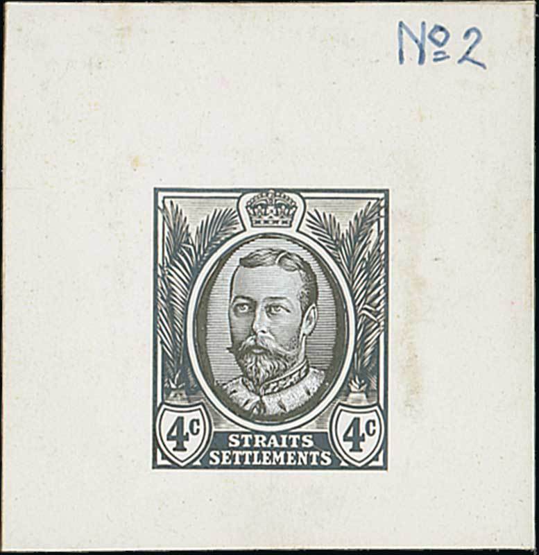 4c. composite printed essay showing almost full face portrait of the King and frame in the issued design, in black on glazed card (44x44mm.) marked "No 2", fine. Photo