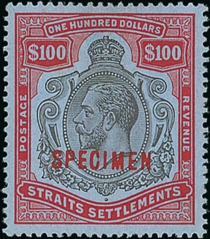 $100 black and carmine on blue overprinted "specimen", well-centred, fine mint. S.G. 214s, £1200. Photo