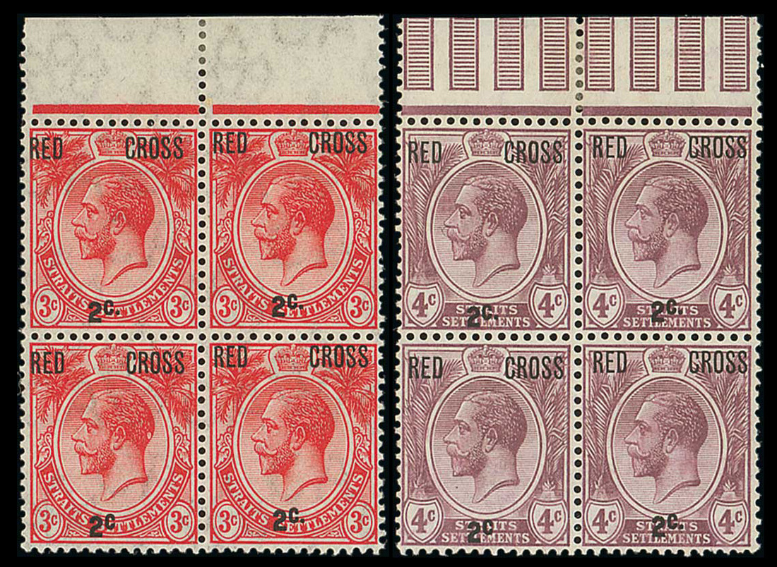 3c.+2c. scarlet and 4c.+2c. dull purple in blocks of four with margin at top (inter-pane on 4c.), one in each showing variety no stop, fine mint. S.G. 216/a-217/a, £1025+. Photo