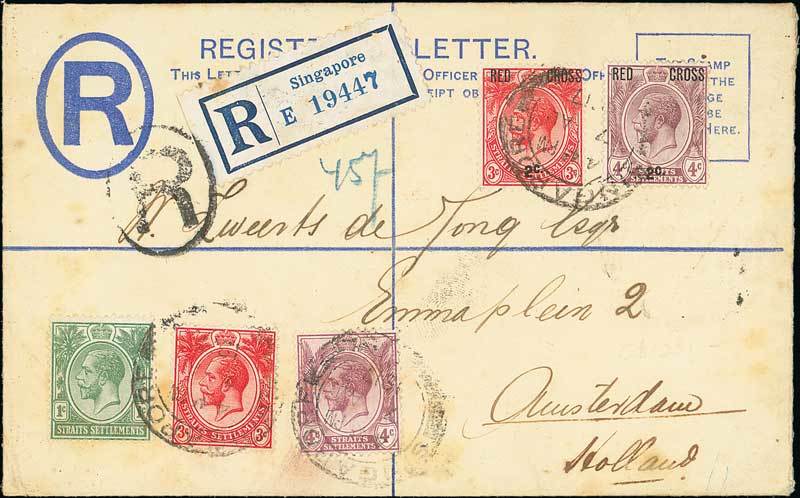 3c.+2c. scarlet and 4c.+2c. dull purple used with unsurcharged 1c., 3c. and 4c. on 1917 (4 Aug.) 10c. registered envelope from Singapore to Amsterdam; some minor staining. Rare. Photo