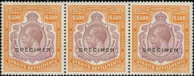 $500 purple and orange-brown horizontal strip of three, each overprinted "specimen", excellent colour, fine mint. An extremely rare multiple. S.G. 240ds, £12,750. Photo