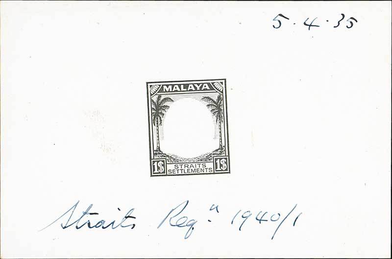 $1 die proof of the frame with value tablet reading "1$", in black on glazed card (92x60mm.) dated "5.4.35" and marked "Straits Reqn 1940/1", fine. Photo
